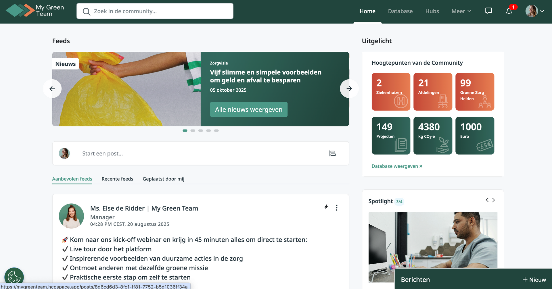 Al een paar jaar liep ik met het idee in mijn hoofd: een online plek waar groene zorgprofessionals elkaar kunnen vinden, ideeën kunnen uitwisselen, en kunnen samenwerken. Een plek waar alles over groene zorg samen komt. Waar je kan bouwen aan een community en hier actief aan kan bijdragen. Een plek waar duurzame zorg versneld wordt dankzij jou, de zorgprofessional. En nu is die droom werkelijkheid!